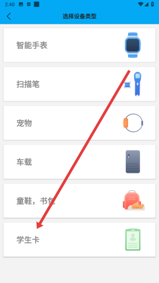 3、在选择设备类型页面中,可以点击底部学生卡选项,进入添加学生卡设备信息。
