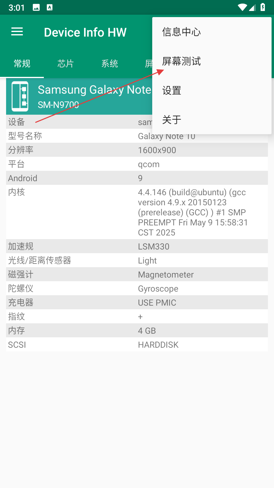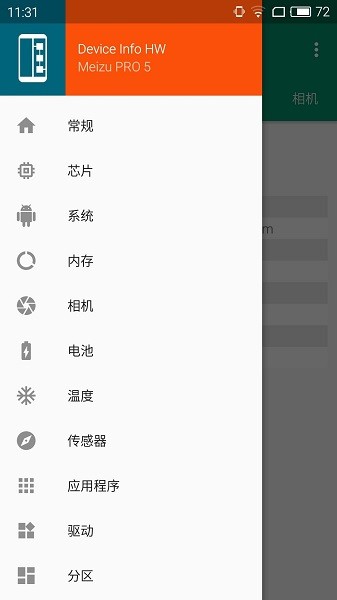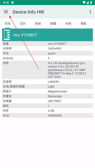 1、打开Device Info HW应用,点击菜单按钮,展开功能选项列表。