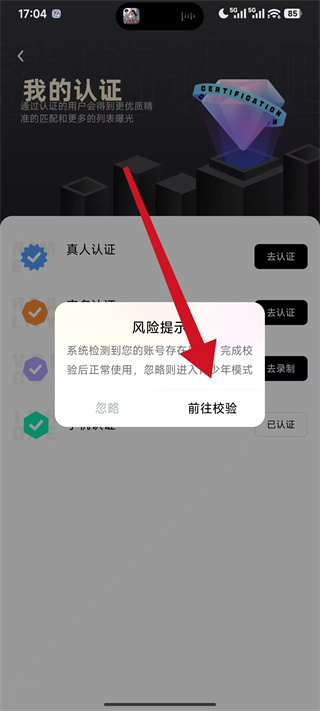 4、若弹出风险提示弹窗,点击前往校验完成对应验证,即可成功关闭他趣的青少年模式。