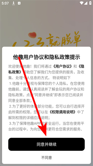 1、打开他趣,在弹窗中,点击同意并继续,进入应用页面。