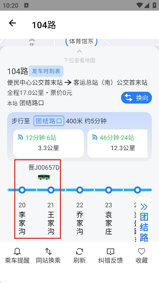 4、进入104路公交线路详情页面后,即可查看该线路的发车时刻表、站点等信息。