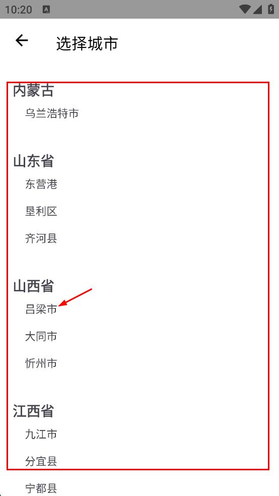 2、在选择城市页面,从列出的城市列表里,找到并点击想要切换的城市,如吕梁市。