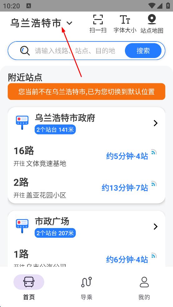 1、打开公交查询软件,点击页面顶部显示的城市名称旁的下拉箭头,进入选择城市页面。