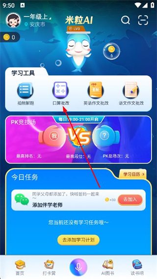 2、在米粒AI页面的学习工具区域,点击口算批改功能选项。