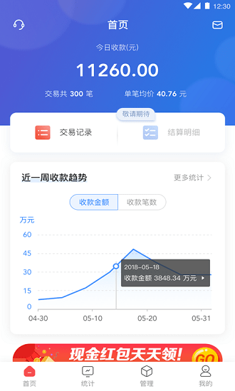 1、点击统计,进入查看本周的交易曲线和方式占比数据