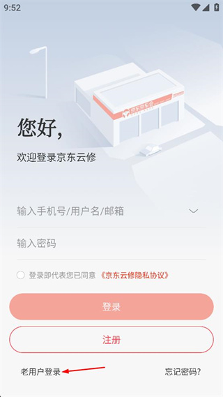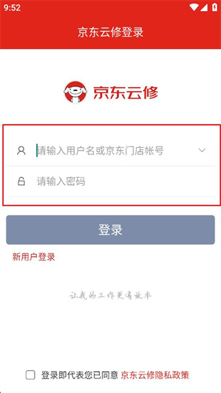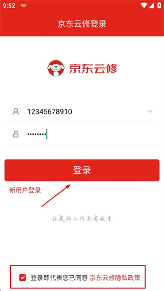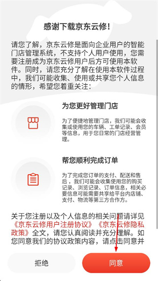 1、打开京东云修后,阅读相关协议政策内容,点击界面中的同意按钮进入登录页面。