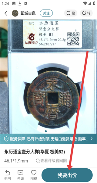 3、拍品详情页面点击“我要出价”,进入出价界面。