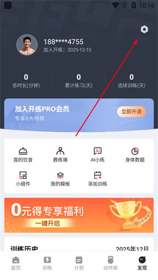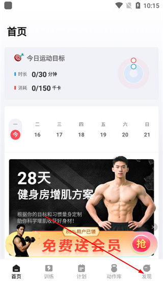 1、打开开练app首页,点击底部导航栏的发现选项,进入个人中心界面。