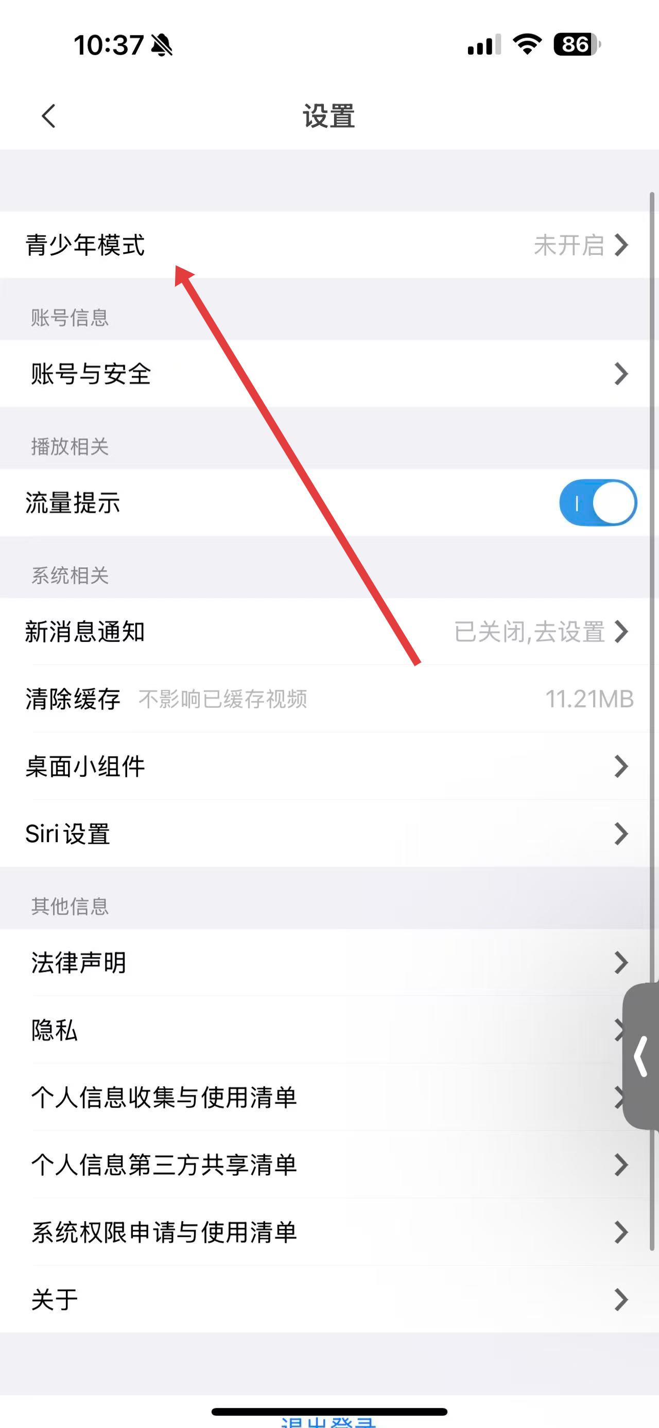 3、在设置界面里,点击青少年模式选项,进入青少年模式设置页面。