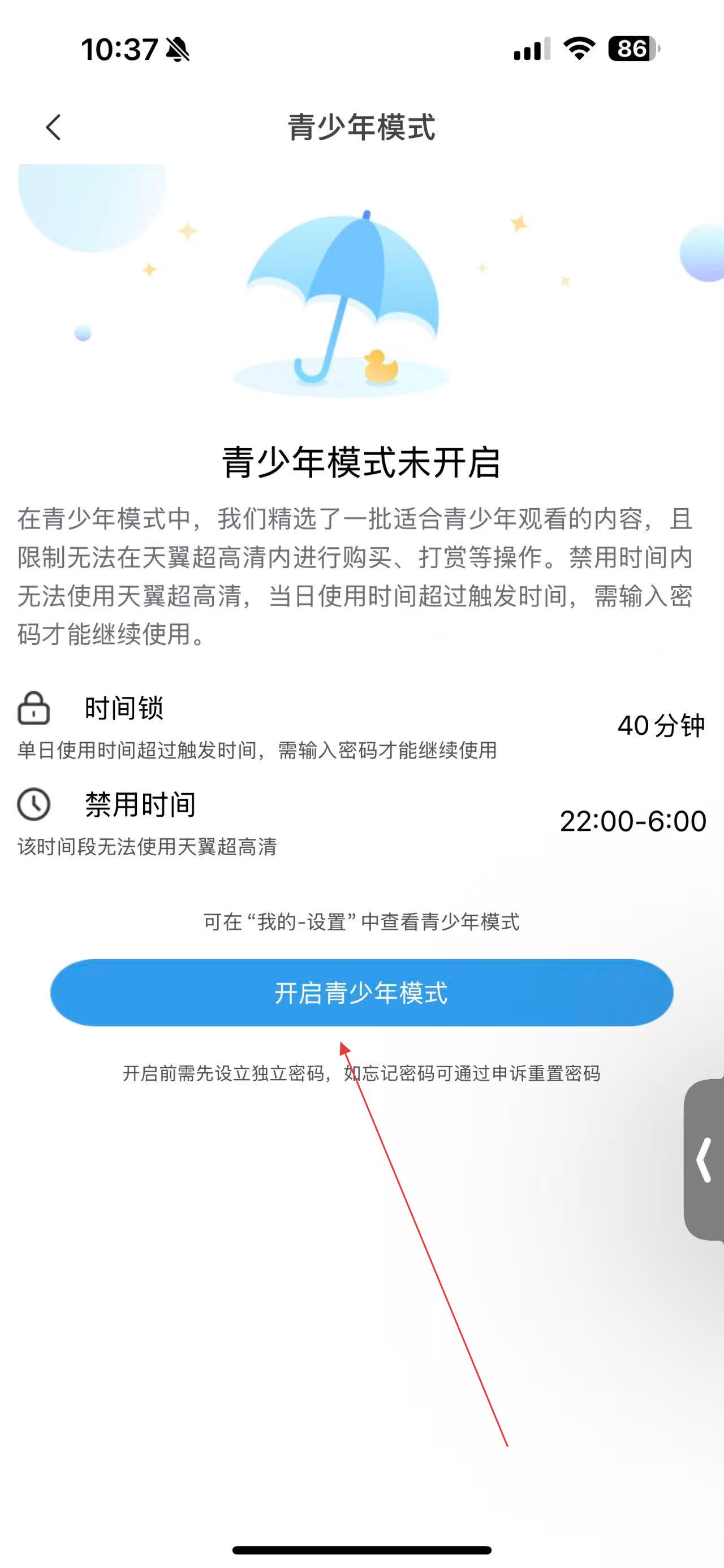 4、在青少年模式设置页面,点击开启青少年模式按钮,按照提示设置独立密码后,即可成功开启。