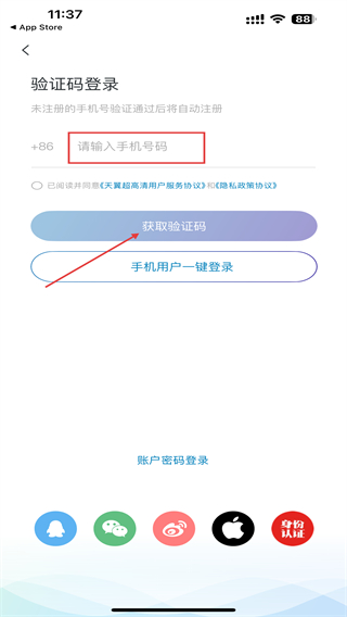 3、在输入框中填写手机号码,勾选同意协议后点击获取验证码。