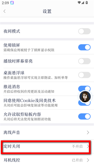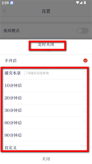 3、在设置页面,点击定时关闭选项,展开定时选项列表。