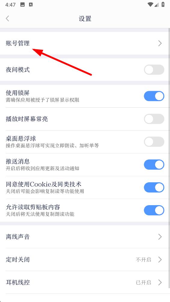 3、在设置页面里点击账号管理选项,进入账号管理相关操作界面。
