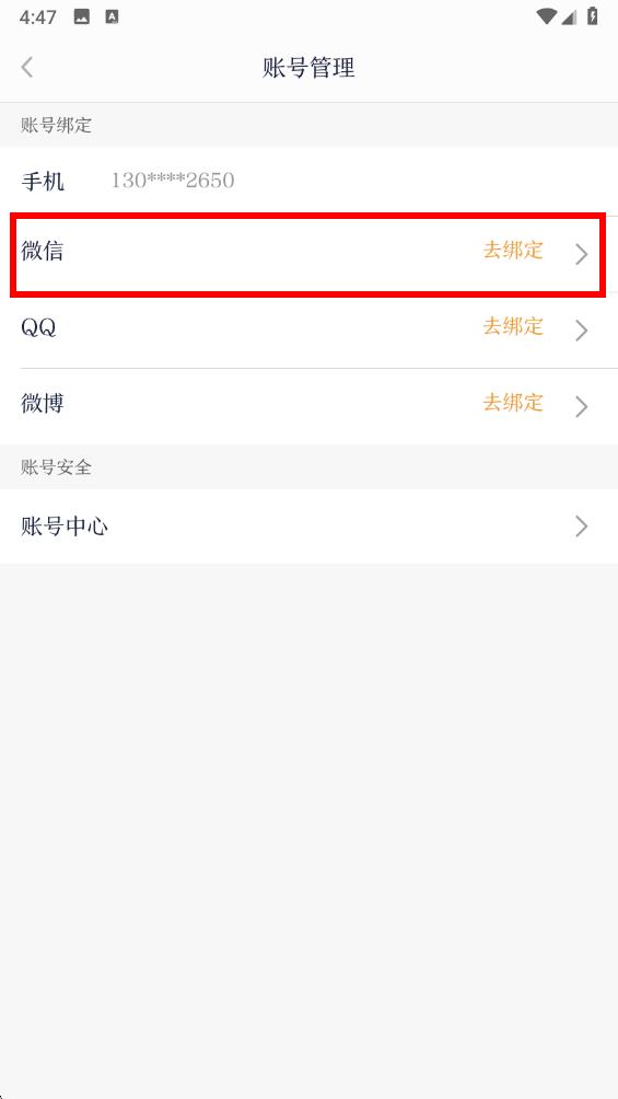 4、在账号管理页面中找到微信选项,点击右侧的去绑定按钮,按照后续提示完成微信授权等操作即可成功绑定微信。
