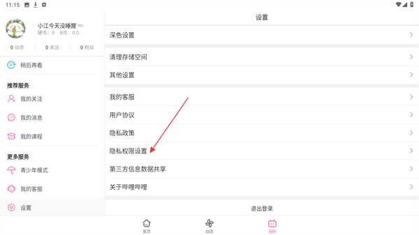 3、在右侧的设置页面里,点击隐私权限设置选项,进入对应的权限管理页面。