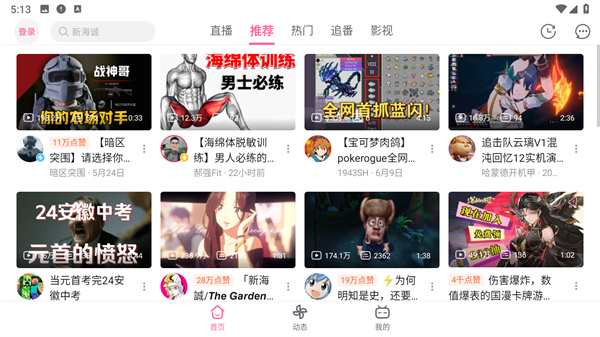 3、同意协议后,系统会自动跳转至主页面推荐页,展示推荐视频流如热门视频、关注内容等。