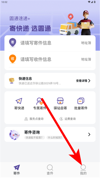 1、在圆通速递主界面,点击底部我的,进入我的个人页面。