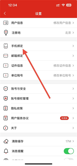 3、在设置页面,点击手机绑定选项,进入验证手机号页面。