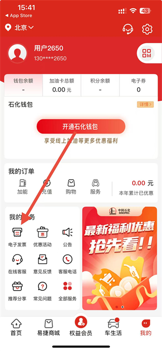 2、在我的页面中,找到电子发票选项,点击该选项进入电子发票相关操作界面。