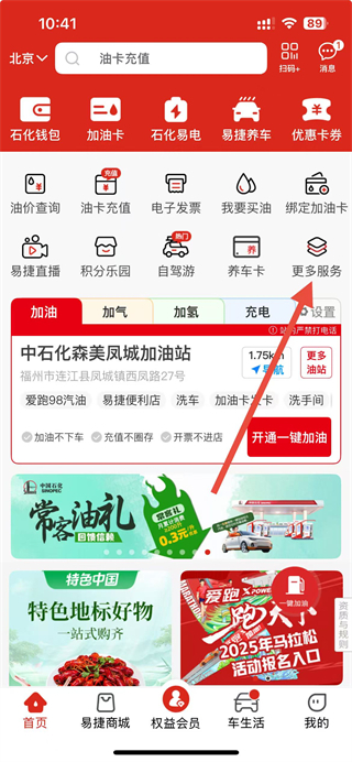 1、打开易捷加油app,在首页点击更多服务选项,进入全部服务页面。