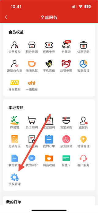 2、在全部服务的本地专区板块中,找到并点击授权管理选项,即可进入账号授权管理页面。