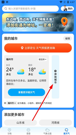 2、在查天气页面点击添加城市按钮,进入添加城市界面。