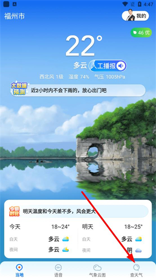 1、打开心悦天气app,在首页点击右下角查天气选项。