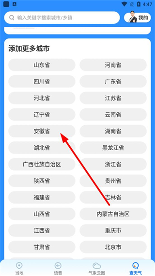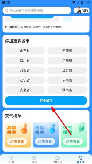 3、在添加城市界面点击更多城市按钮,展开更多城市列表。