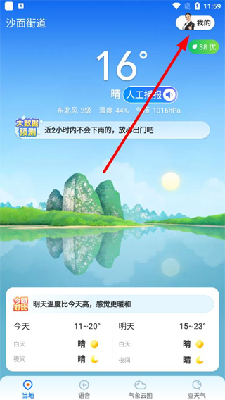 1、在心悦天气主界面,点击右上角我的,进入我的页面。