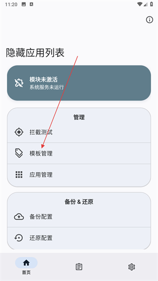 1、打开隐藏应用列表页面找到模板管理选项,点击进入模板管理界面。