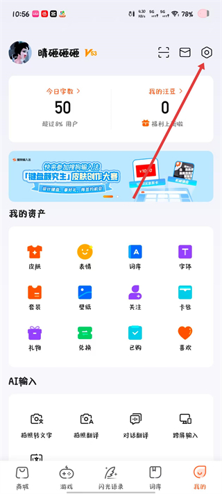 1、打开搜狗输入法进入我的页面,点击右上角设置图标,进入设置操作界面。