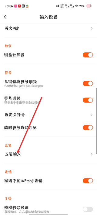 3、在输入设置页面中找到五笔输入选项并点击,进入五笔输入功能设置界面。