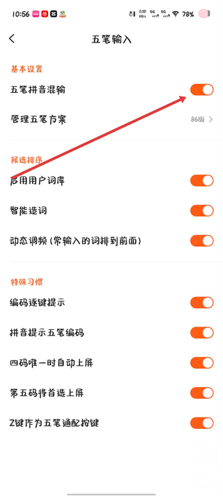 4、在五笔输入界面找到五笔拼音混输对应的开关按钮,点击将其切换为开启。