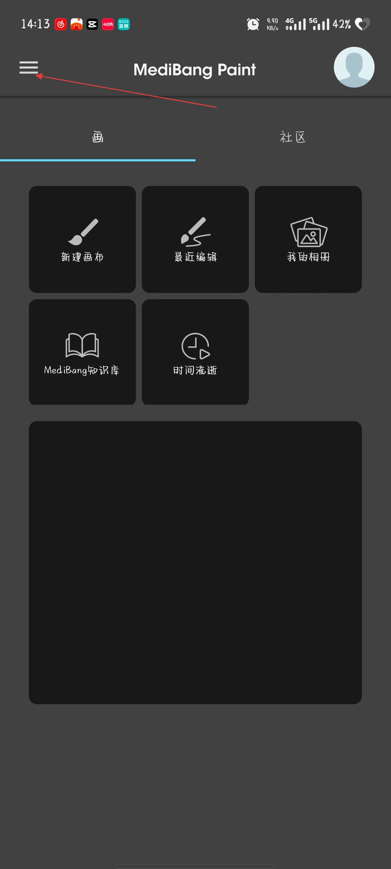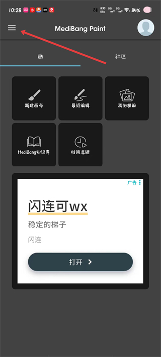 1、打开MediBang Paint应用,点击界面左上角三条横线的菜单按钮,展开侧边栏菜单。