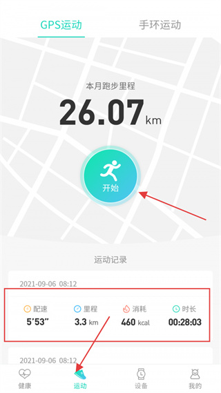 2、在运动页面可查看本月跑步里程、历史运动记录,点击开始可启动GPS运动模式,同步记录运动数据。