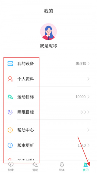 4、在“我的”页面可管理绑定设备、完善个人资料,还能设置运动目标、睡眠目标,查看帮助中心、版本更新等服务选项。