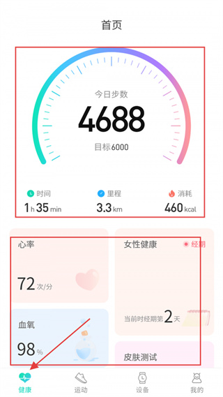 1、在健康页面可查看今日步数、运动时长、里程、消耗热量,监测心率、血氧等身体数据,还支持女性健康、皮肤测试等信息记录。