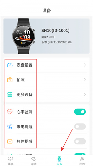 3、在设备页面可绑定智能设备,支持表盘设置、拍照控制,还能开启心率监测、来电/短信提醒等设备功能。