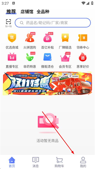 1、打开1药城app首页,点击底部导航栏的我的选项,进入个人中心界面。