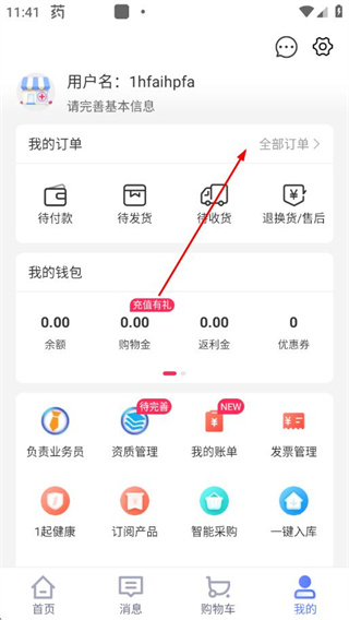 1、打开1药城APP,点击底部我的,进入个人页面。
