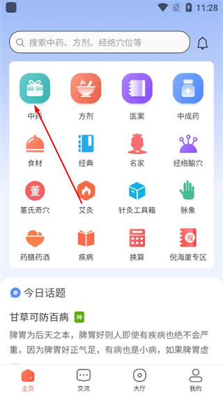 1、打开中医之家app首页,点击中药图标,进入中药列表页面。