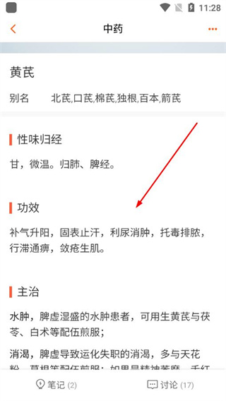 3、在中药详情页中,即可查看该中药的性味归经、功效、主治等信息。
