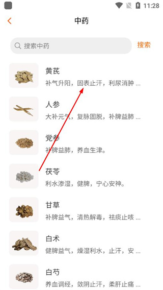 2、在中药列表中选择目标中药,点击进入该中药的详情页面。