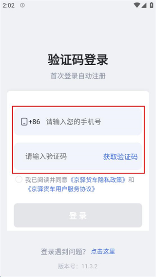 2、在登录界面输入手机号码,点击获取验证码,输入收到的验证码。