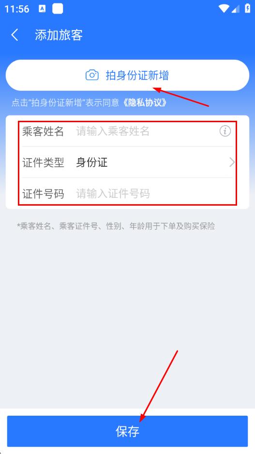 4、在添加旅客页面,可选择拍身份证新增快速添加,也可手动输入信息,点击保存按钮,完成乘客添加。