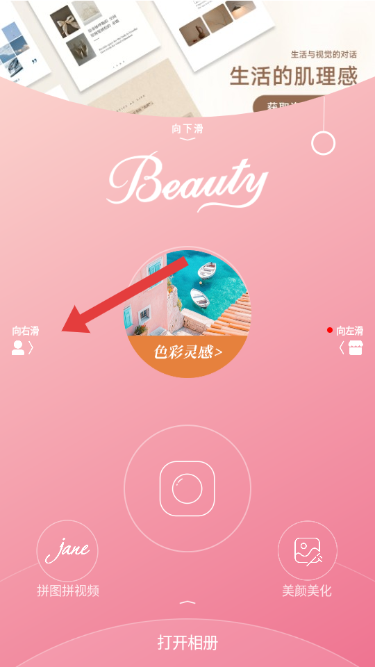 1、在美人相机的首页,需要向左滑动界面,进入个人服务的页面。