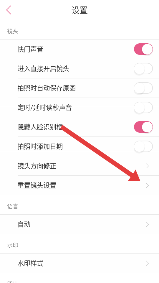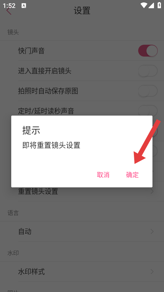 3、在设置界面中,找到并点击重置镜头设置选项,弹出提示确认框。