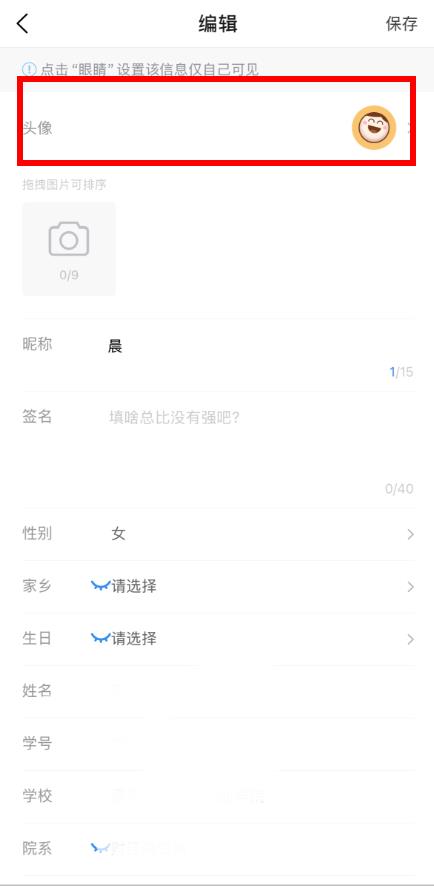 3、在资料编辑页面,点击头像区域,进入头像更改界面。