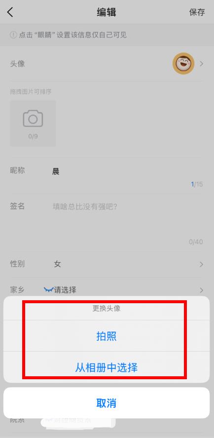 4、在头像更改界面,选择拍照或从相册中选择,即可完成头像修改。