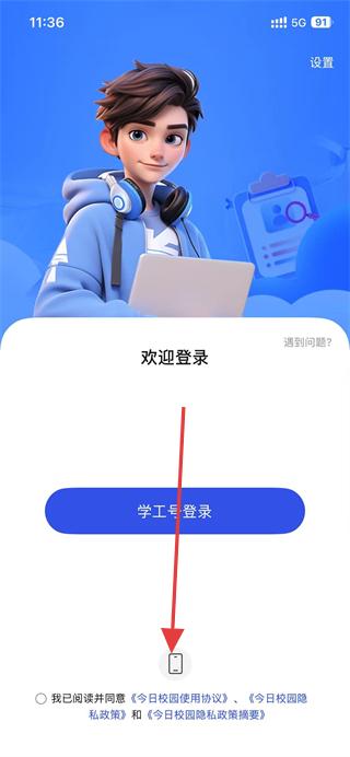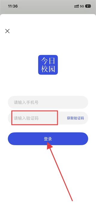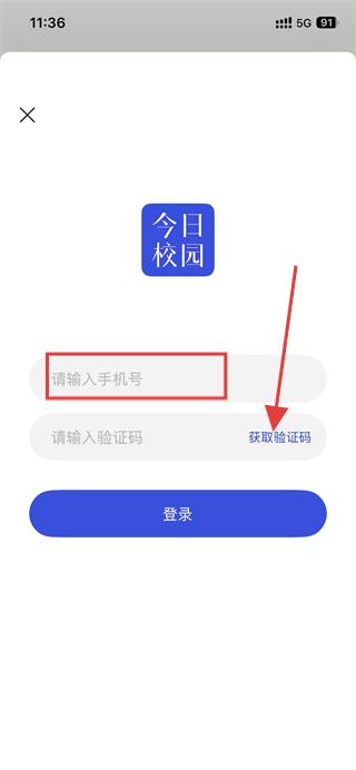1、打开今日校园APP,在登录页面点击页面下方的手机图标。
